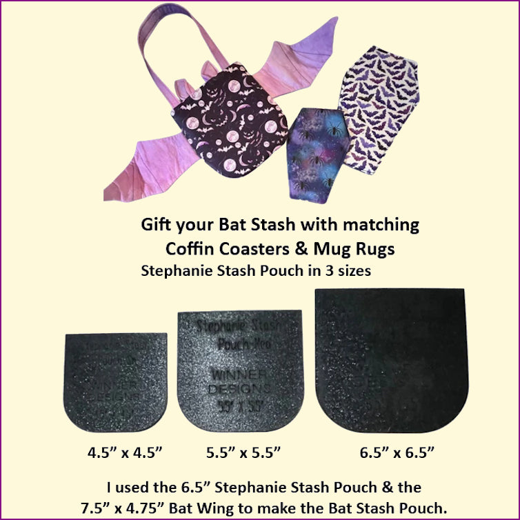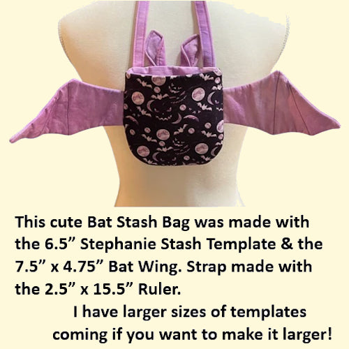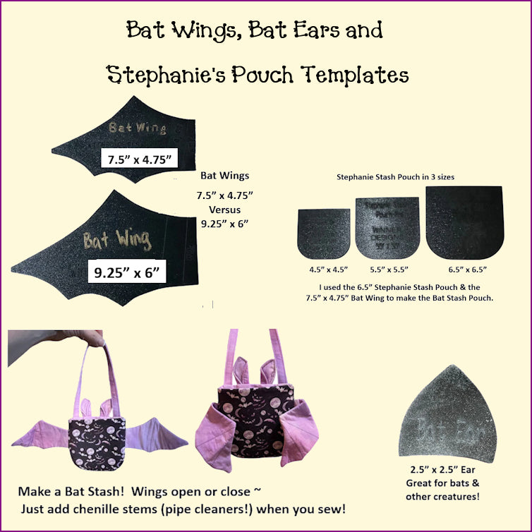 The Bat Stash Bag was made using the 6.5" x 6.5" Stephanie Stash Pouch, the 7.5" x 4.75" Bat Wing and my 2.5" x 15.5" Ruler (from the Tiny Pouch Rulers). I also created a Bat Ear Template since I didn't like how mine turned out using a paper template!