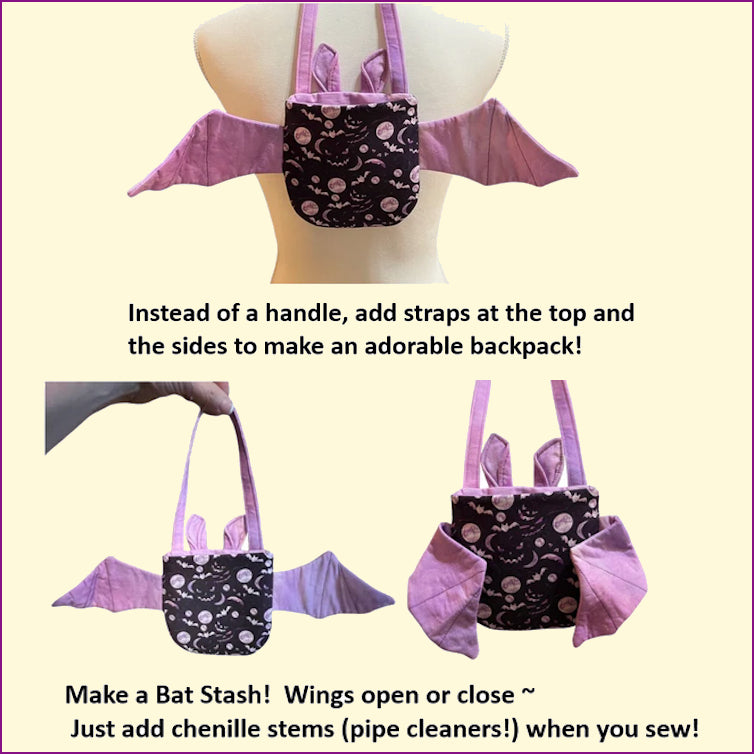 Or choose plush fabrics and sew right sides together, turn and stuff. Then attach your wings to a simple rectangle or square shape and hand or machine stitch a bat face for a fun or scary stuffed bat.