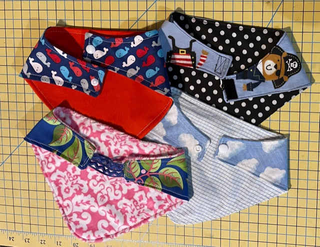 My video shows lots of options for closures (snaps, velcro, elastic headbands, buttons) and talk about appropriate fabrics to use. I even show how to make the bib a bit larger for toddlers.