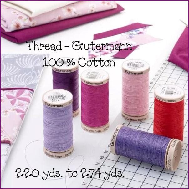 With this purchase you will receive one spool of Gutermann’s 100% cotton thread not mercerized. Depending on the color chosen, the spool will contain 220 or 274 yard yards.
