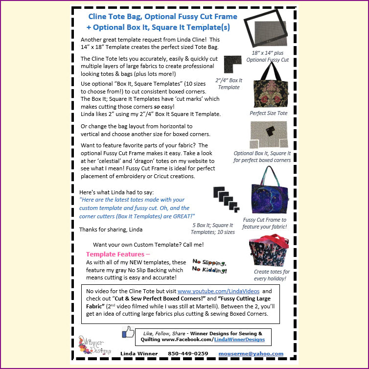 "Here are the latest totes made with your custom template and fussy cut. Oh, and the corner cutters (Box It Templates) are GREAT!"