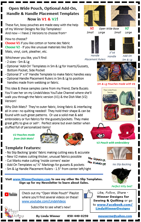 Big NEWS - New videos coming! I've got 2 new videos featuring the V2 Templates & using Dish Mats as fabric. Darla filmed a set of videos showing how to make the Open Wide Pouch using Dish Mat 'material'. So stay tuned!