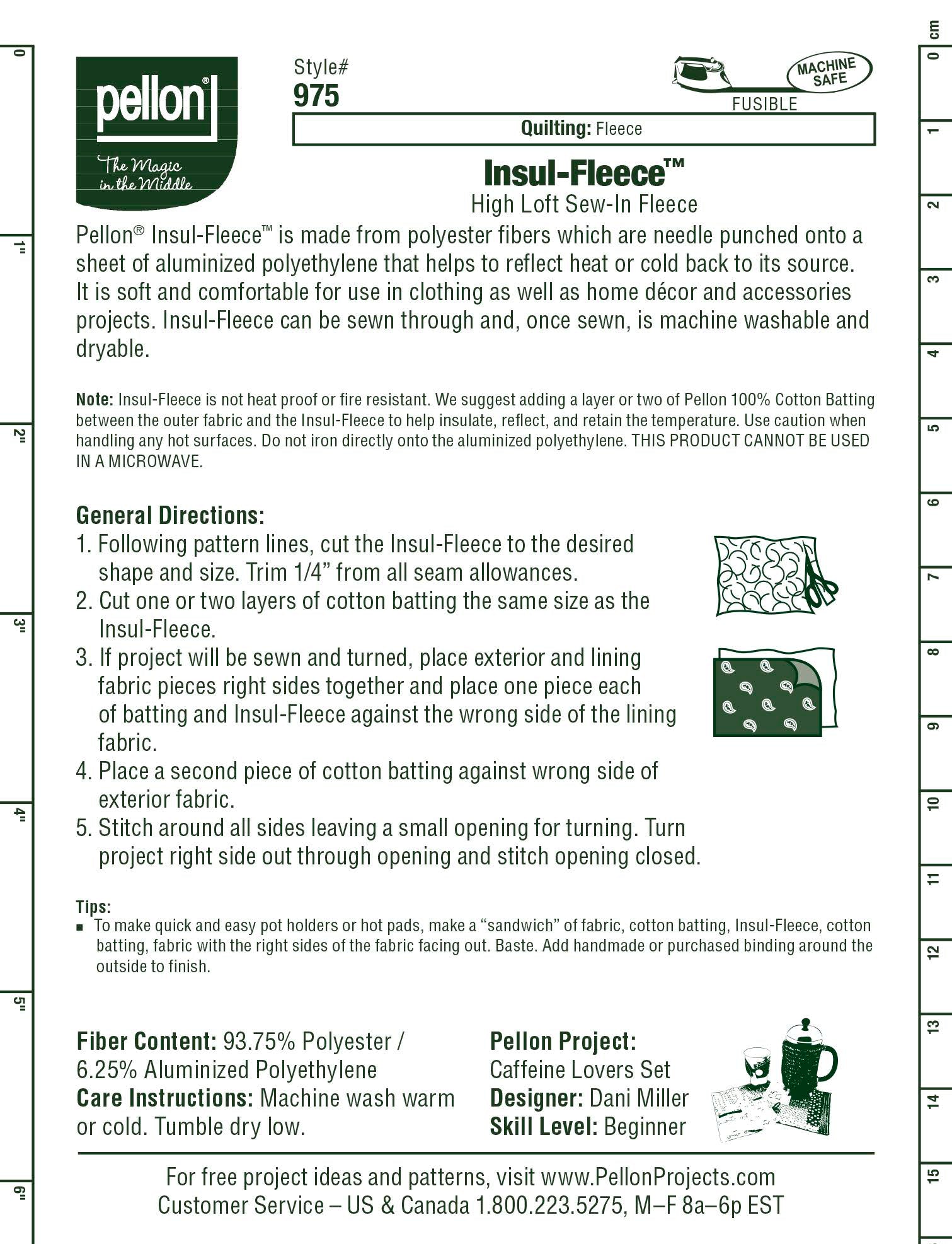 Pellon 975 Insul-Fleece is a polyester fleece blend which reflects heat or cold back to the source to help retain desired temperature. It insulates to keep hot things hot and cold things cold for a longer period of time than traditional fleece. It is soft and comfortable with a medium loft; which makes it versatile for home decor, kitchen accessories, and clothing. 975 can be easily sewn through and once your project is finished it can be machine washed and dried.