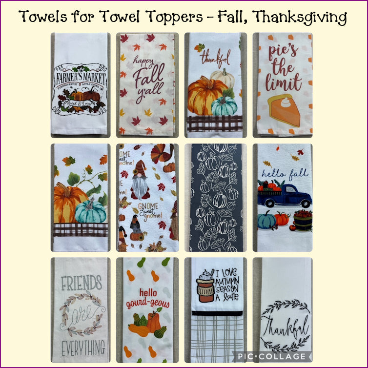 All of these will work well with my Towel Topper Templates. Some are thinner tea towels which are super easy to sew, some are microfiber (great for dusting); and some are a bit thicker but not too thick. If you're not sure about a particular one you see, zoom in for a closer look or call me for more details. (850-449-0259)